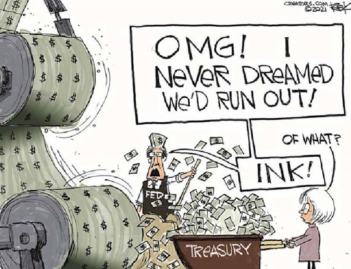 This is Trump’s version of the dystopian Brave New World. And as a cartoon shows, the US dollar printing machine may now be even running out of ink. In the words of the Chinese curse, we are indeed living in interesting times.